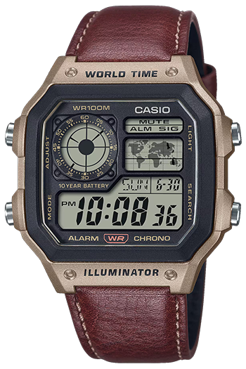 CASIO AE-1200WHL-5AV. Con una esfera digital situada en la parte superior izquierda, puedes mantener la hora de vuelta a casa siempre visible, incluso mientras usas otras funciones como el cronómetro. El mapa del mundo en la parte superior derecha se sincroniza con la hora actual en la pantalla LCD