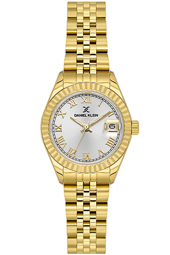 Reloj analógico para mujer DANIEL KLEIN DK-14097-2, Con esfera plateada y caja y correa dorada de acero. 28 mm.