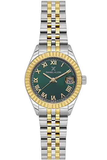 Reloj analógico para mujer DANIEL KLEIN DK-14097-4, Con esfera verde con fecha, caja plateada con bisel dorado y correa de acero bicolor. 28 mm.