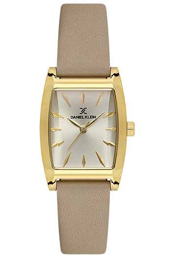 DANIEL KLEIN DK-14120-4. Reloj analógico para mujer de diseño rectangular de 23 × 33mm. Cuenta con una esfera plateada con acabado rayos de sol, una caja de acero dorada y una elegante correa de piel gris. Equipado con un fiable movimiento de cuarzo japonés.
