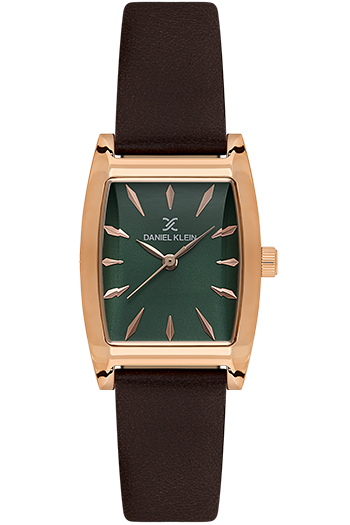 DANIEL KLEIN DK-14120-6. Reloj analógico para mujer de diseño rectangular de 23 × 33mm. Cuenta con una esfera verde con acabado rayos de sol, una caja de acero oro rosa y una elegante correa de piel marrón. Equipado con un fiable movimiento de cuarzo japonés.