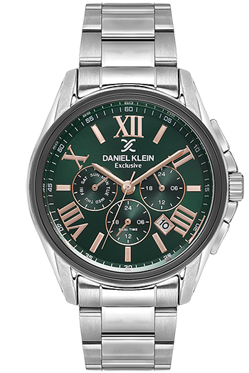 DANIEL KLEIN DK-14222-3. Reloj multifunción. Cuenta con una esfera verde con tres sub-esferas, una caja de acero de 43 mm y una elegante correa de acero plateada. Su movimiento de cuarzo japonés y su resistencia al agua hasta 50 metros lo convierten en el complemento perfecto para el día a día.