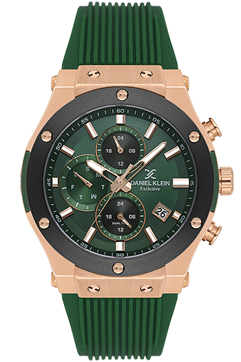 DANIEL KLEIN DK-14228-5. Reloj multifunción. Cuenta con una esfera verde con tres sub-esferas, una caja de acero de 42mm y una correa de silicona verde. Su movimiento de cuarzo japonés y su resistencia al agua hasta 50 metros lo convierten en el complemento perfecto para el día a día.