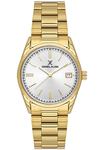 DANIEL KLEIN DK-14133-2. Reloj analógico para mujer. Cuenta con una esfera plateada con fecha, una caja de acero de 30mm y una elegante correa de acero dorada. Equipado con un fiable movimiento de cuarzo japonés.