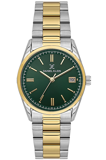 DANIEL KLEIN DK-14133-3. Reloj analógico para mujer. Cuenta con una esfera verde con fecha, una caja de acero de 30mm y una elegante correa de acero bicolor. Equipado con un fiable movimiento de cuarzo japonés.