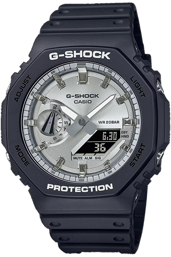 G-SHOCK GA-2100SB-1A. El brillo pulido del color metálico y la icónica forma octogonal del DW-5000C, el G-SHOCK original, se funden en este resistente reloj de combinación digital-analógica que mide tan solo 11,8 mm desde el bisel hasta la parte posterior de la carcasa.