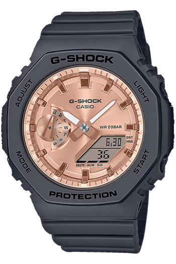 G-SHOCK GMA-S2100MD-1A. Añade personalidad a cualquier conjunto con un toque de oro rosa brillante en la muñeca. Estos relojes GMA-S2100 cuentan con una esfera plana acabada con acabado de vapor de oro rosa y marcas de índice de barras simples para un aspecto sencillo, minimalista y brillante.