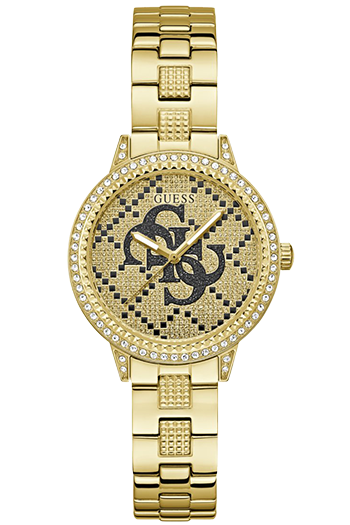 GUESS G GLACE GW0944L2. Esta caja redonda de 34 mm en tono dorado presenta un bisel de cristal y se complementa con un brazalete pulido. El logotipo negro Quattro G en la esfera color champán, delicado pero potente, le aporta un toque vibrante.