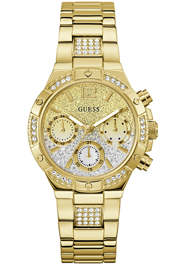 GUESS HARLOW GW0950L2. Dale un toque de brillo a tu estilo con este hermoso reloj. La caja dorada de 38 mm luce cristal en el bisel y combina a la perfección con una esfera multifunción con purpurina dorada y plateada. Un brazalete de acero inoxidable dorado con un toque de cristal completa el look.