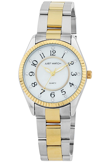JUST WATCH JW10259-002 con correa de acero inoxidable y imitaciones de piedras preciosas. La caja del reloj tiene un diámetro de 32 mm y presenta un bisel estriado que aporta un toque especial al diseño clásico. La brillante esfera de nácar cuenta con números arábigos de fácil lectura.
