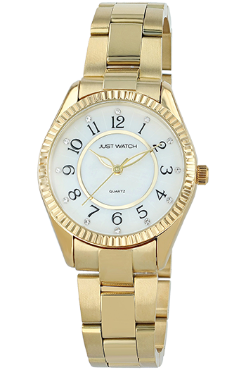JUST WATCH JW10259-003 con correa de acero inoxidable y imitaciones de piedras preciosas. La caja del reloj tiene un diámetro de 32 mm y presenta un bisel estriado que aporta un toque especial al diseño clásico. La brillante esfera de nácar cuenta con números arábigos de fácil lectura.