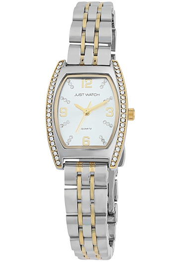 Reloj de mujer Akadia de JUST WATCH, con su exclusiva caja de forma tonneau, adornada en los laterales con brillantes piedras de imitación. La esfera combina números arábigos con piedras de imitación como índices de barra, lo que le da a este reloj un toque especial.