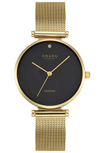 Un diamante certificado SI1 de corte único brilla a las 12 en punto en este reloj de mujer de 32 mm. Sobre una esfera negra con delicados detalles ondulados y marcadores sutiles, la caja de acero inoxidable chapada en oro y el brazalete de malla a juego aportan calidez y elegancia.