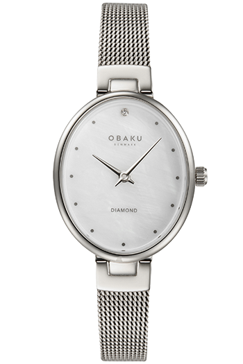 OBAKU OVAL STEEL V312LXCWMC. Con su delicada caja de forma ovalada, destaca como una elegante alternativa a los diseños tradicionales. Con una esfera de nácar auténtico, que brilla con profundidad natural y singularidad y un diamante de 1 mm SI1 de talla simple, procedente de fuentes responsables.