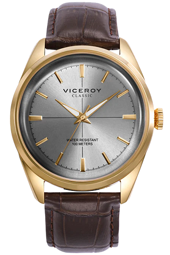 VICEROY 401375-17. En este estiloso modelo de reloj para hombre de tres agujas brillan dos mundos, clásico y moderno. Con caja de acero, correa en piel marrón y esfera en plata, nos trae lo mejor de ambos mundos. El cristal bombe y los índices dorados no hacen más que confirmar su carácter.