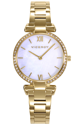 VICEROY 42446-03. Este reloj de mujer de dos agujas destaca por su diseño elegante y sofisticado. La caja de acero con IP dorado y el bisel adornado con circonitas blancas aportan un toque de lujo.